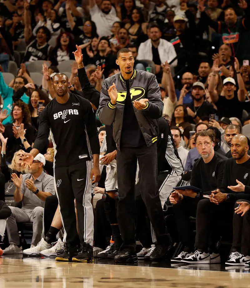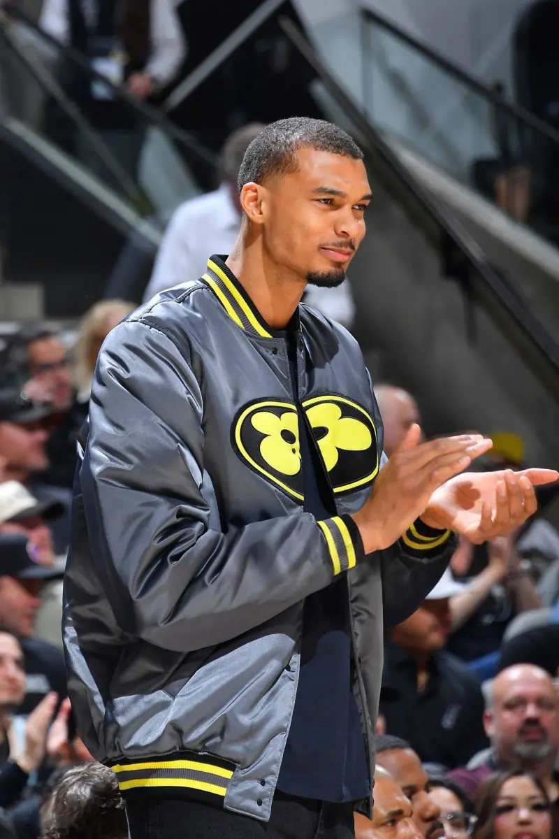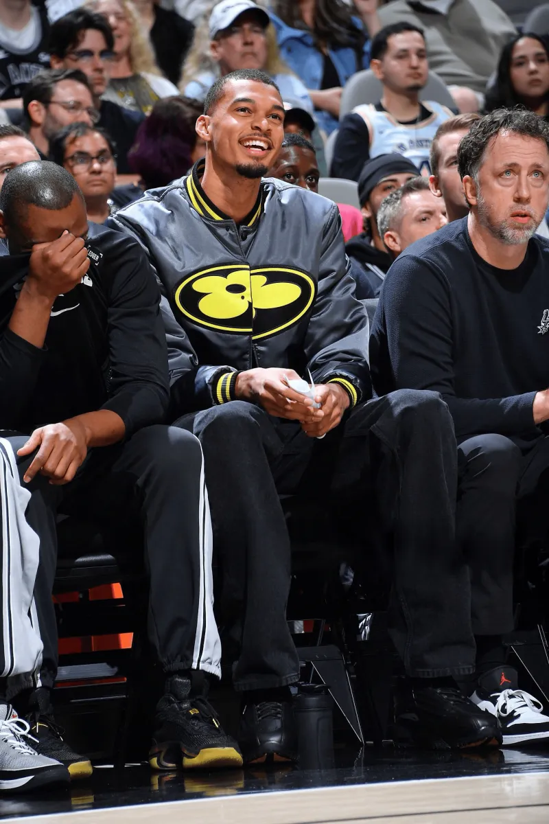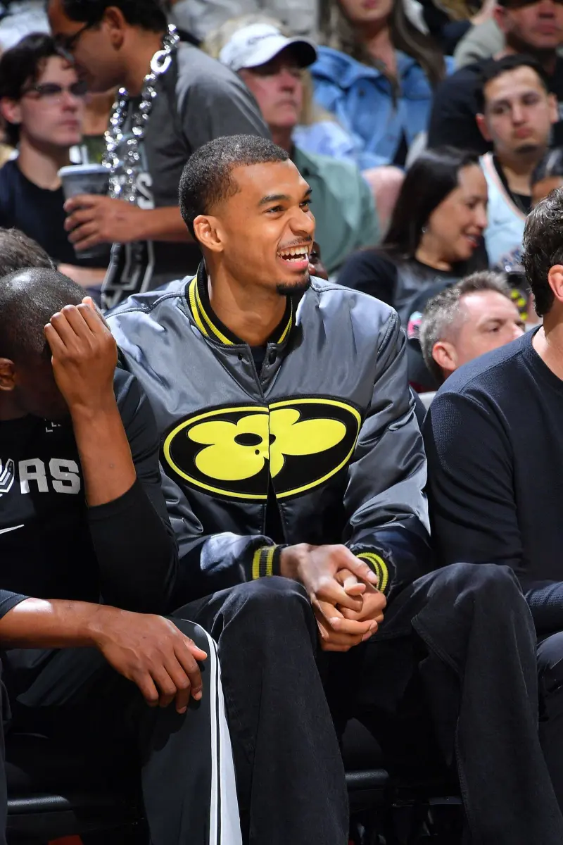 比赛期间,维克托-文班亚马身着LV×Nigo联名款丝缎棒球夹克在场下为队友鼓掌喝彩。